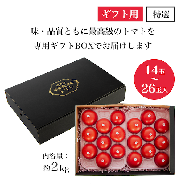 味はもちろん、傷もなく、形もきれいな特選トマトを専用の化粧箱に入れてお届けしますので、最高級のトマトギフトで日頃の感謝を伝えませんか?